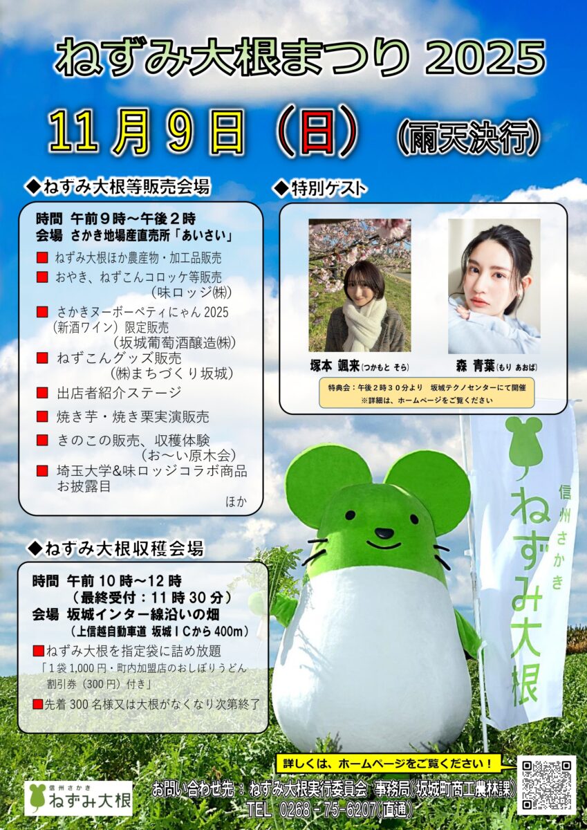 3年ぶり15回目の開催となる今年は、ねずみ大根の販売・収穫体験をはじめ、地域農産物や加工品の販売のほか、特別ゲストとして塚本颯来さんと森青葉さんをお迎えし、盛大にまつりを開催♪ねずこんも出演予定☆